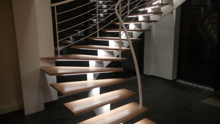 Escalier avec un limon porteur reconstitué. Vous avez la possibilité de le personnaliser avec le choix de découpe des supports de marche, l’essence de bois, les garde-corps, la couleur et la possibilité d’éclairage LED.